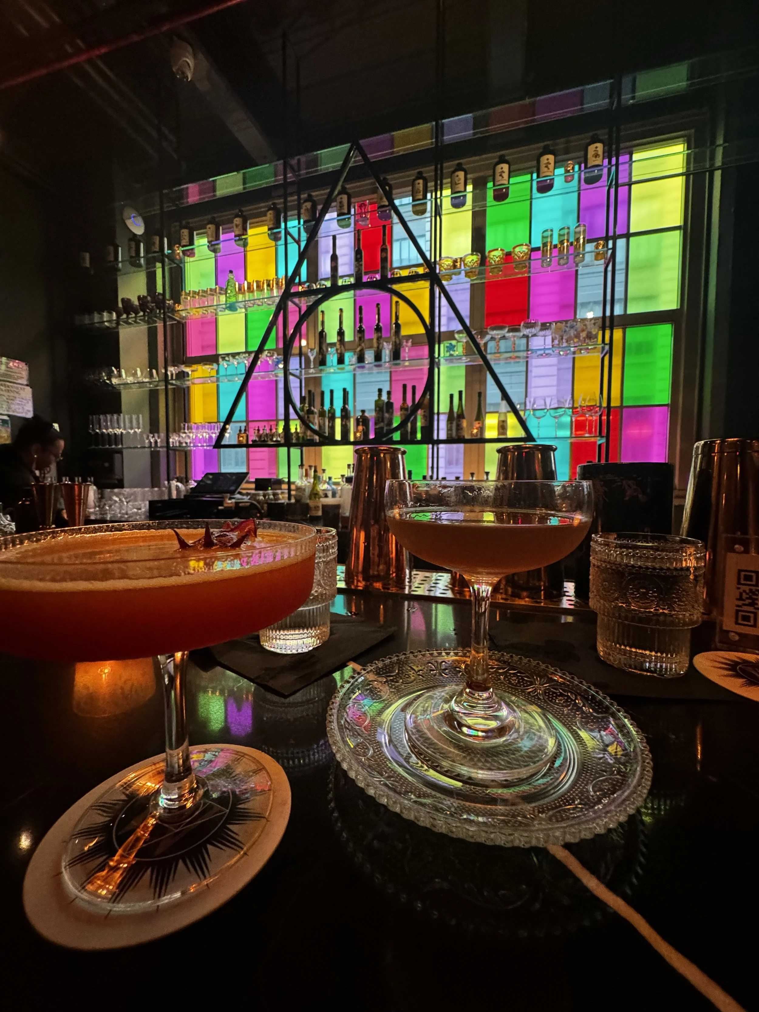 But it gets even better! The true show-stopper of the space is the mesmerizing mosaic behind the bar. Featuring the Philosopher’s Stone, this mosaic reflects the stone’s power to transform base metals into precious ones — symbolizing Bitter Monk’s ambition to elevate the cocktail experience into pure magic. Reminiscent of stained glass in religious architecture, this magical display infuses the space with a sense of wonder and reverence. And when the sunlight hits the mosaic just right, the whole room comes alive with a kaleidoscope of color that dances across the flavorful cocktails.